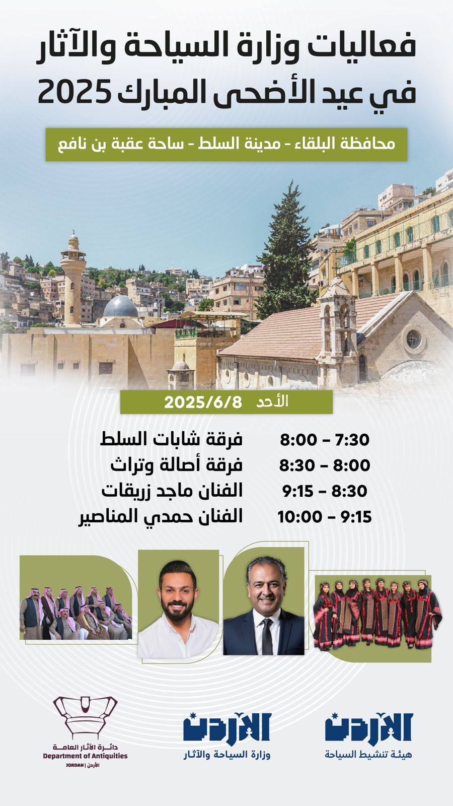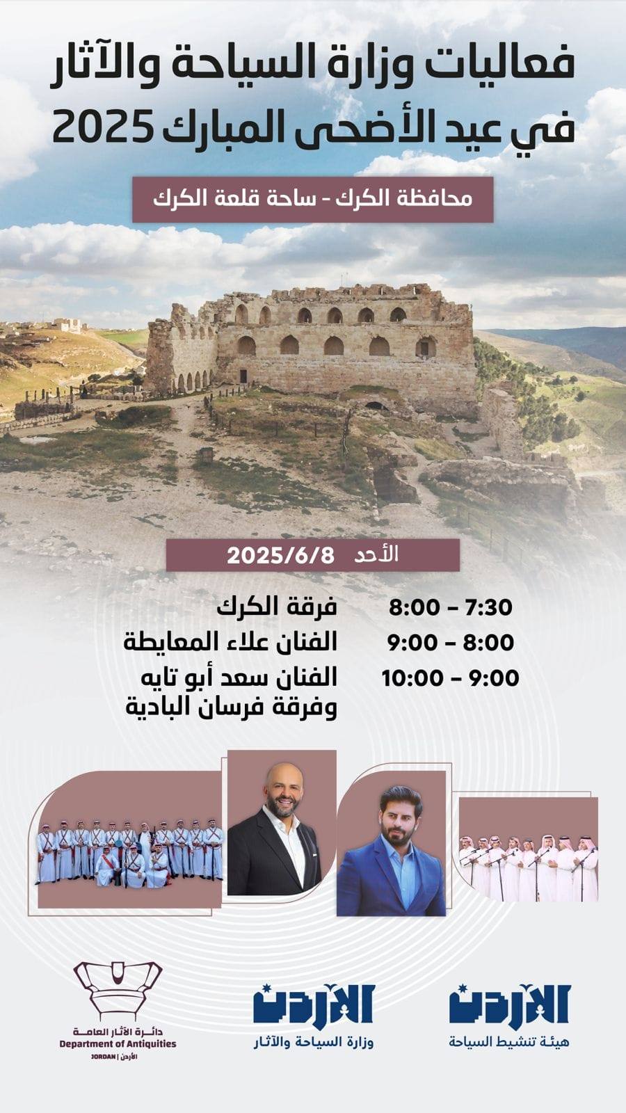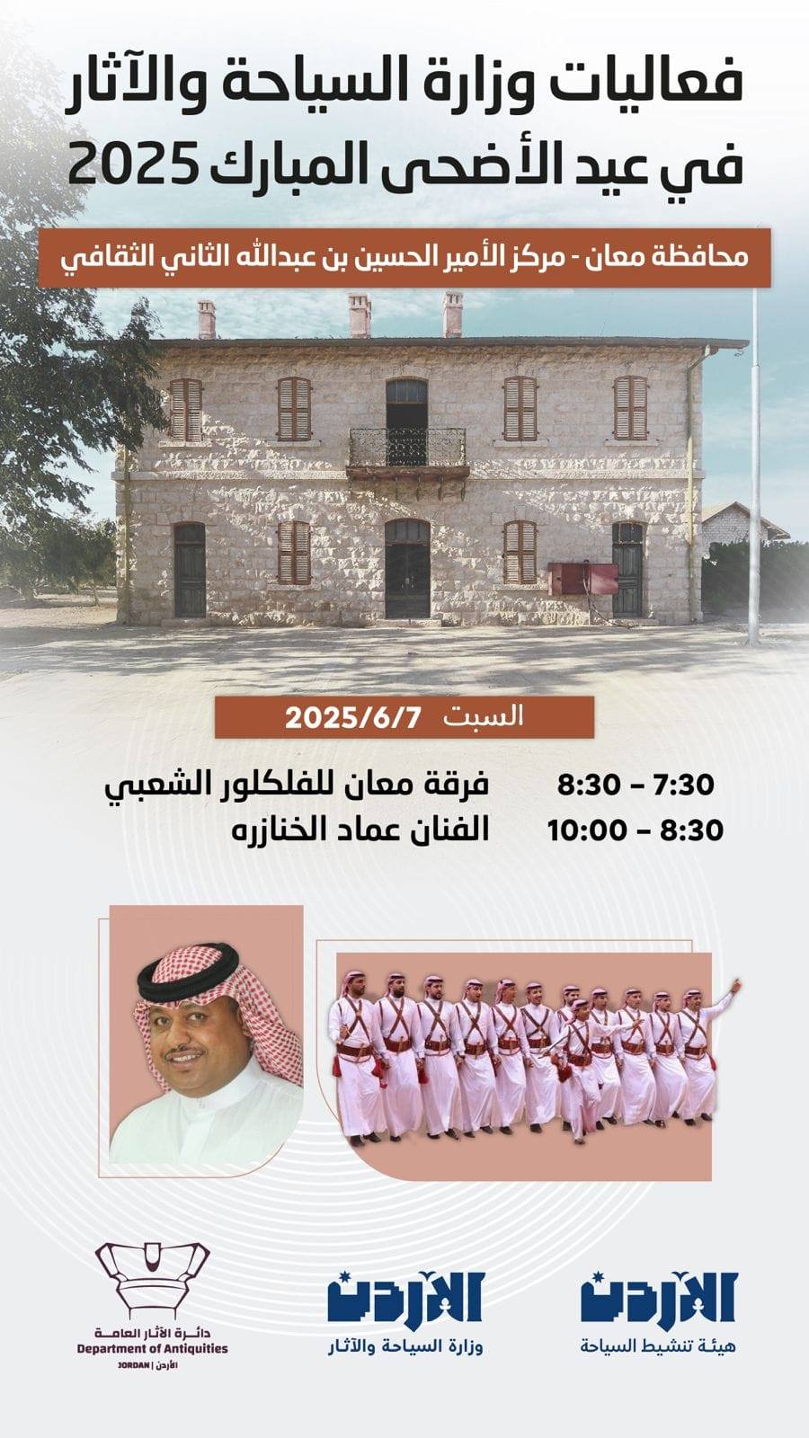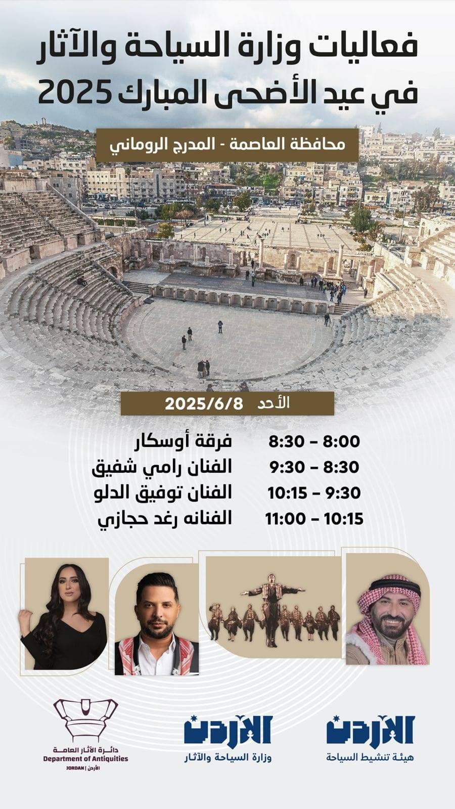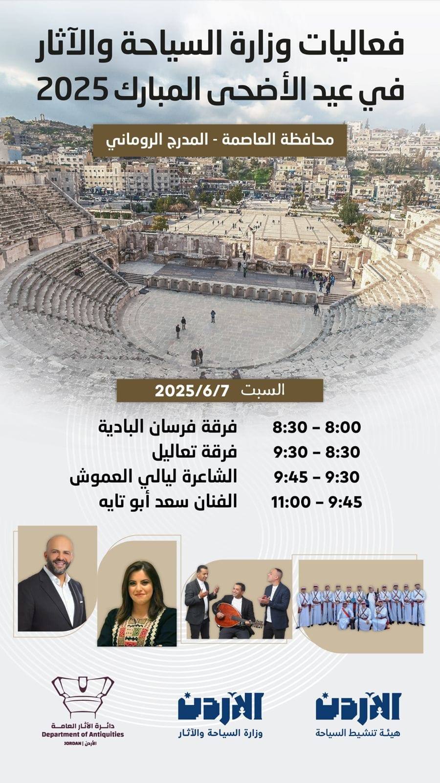 أعلنت وزارة السياحة والآثار بالتعاون مع هيئة تنشيط السياحة ودائرة الآثار العامة، عن تنظيم سلسلة من الفعاليات والأنشطة السياحية والثقافية خلال عطلة عيد الأضحى المبارك، في عدد من المواقع السياحية والأثرية المنتشرة في مختلف محافظات المملكة. وقال أمين عام وزارة السياحة والآثار الاستاذ الدكتور فادي بلعاوي، إن هذه الفعاليات التي ستقام في ثاني وثالث أيام العيد، تهدف إلى تعزيز أجواء الفرح والبهجة، وتشجيع السياحة الداخلية، وتعميق ارتباط المواطنين والزوار بالإرث الحضاري والثقافي الغني الذي يتميز به الأردن.