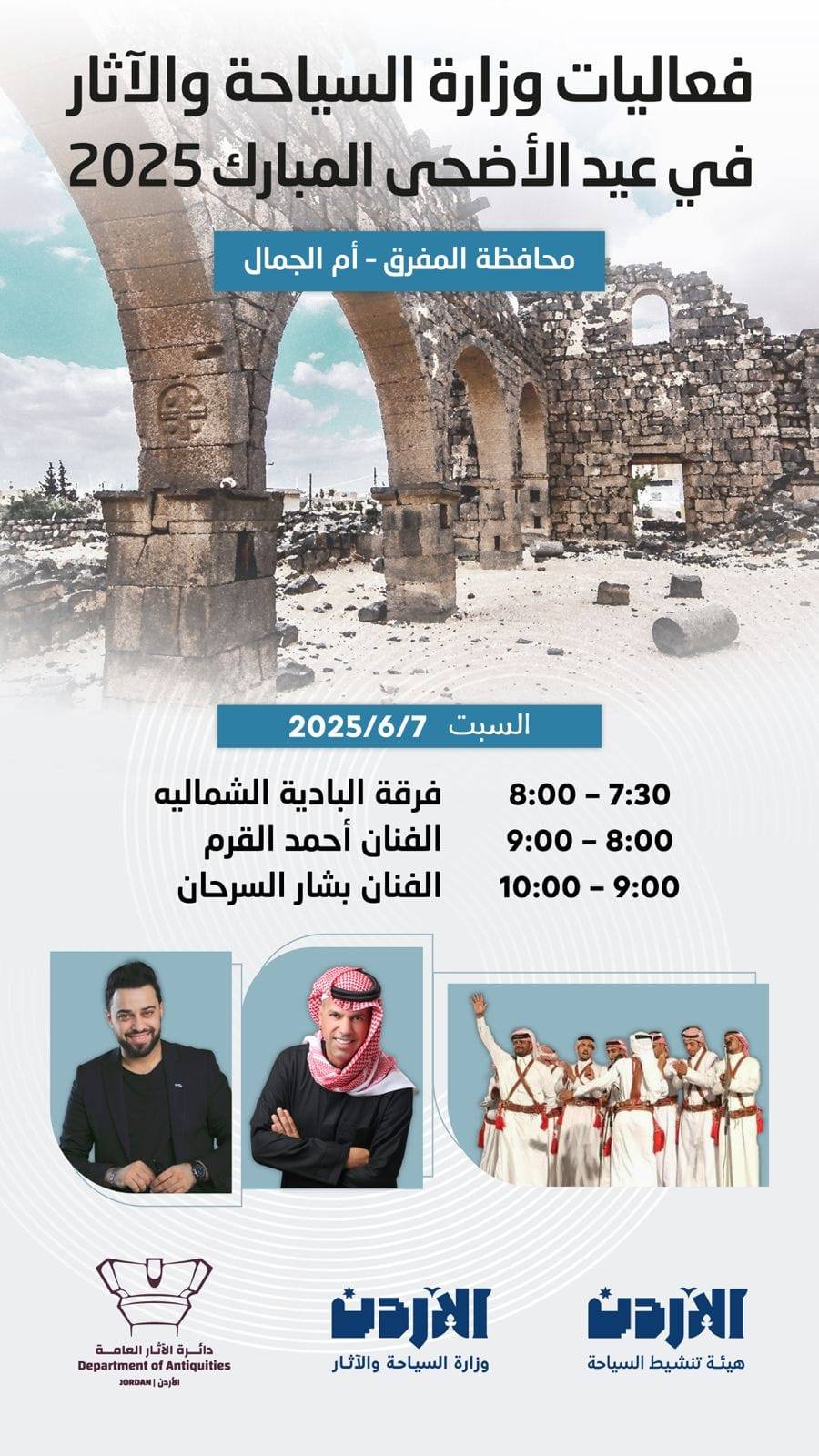 وفي محافظة المفرق، ستقام يوم السبت الموافق 7 حزيران 2025، فعاليات فنية في منطقة أم الجمال، حيث تحيي فرقة "البادية الشمالية" عرضاً فلكلورياً، تليها فقرات غنائية يقدمها الفنان بشار السرحان والفنان احمد القرم.